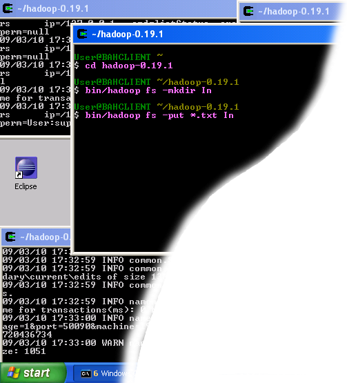 cd hadoop-0.19.1When the last of the above commands starts executing, you should see some activity in other Hadoop windows as shown in the image below.